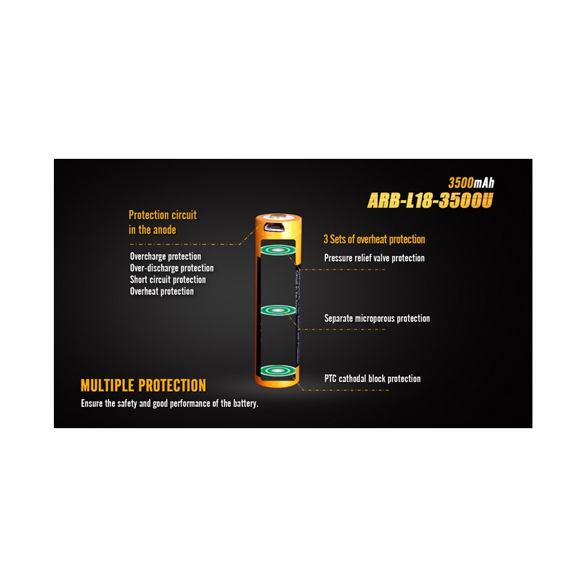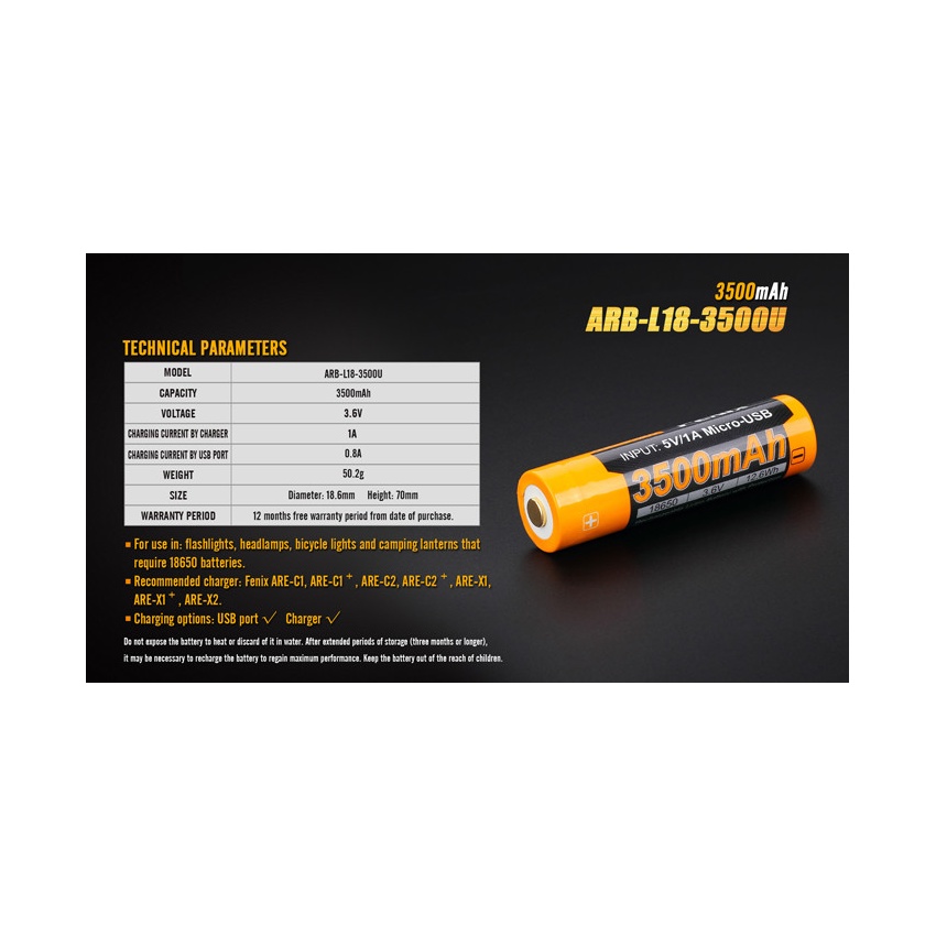 Disainitud kasutamiseks Fenix taskulampides, millel ei ole otselaadimissüsteemi või millel on tootja poolt kaasa pandud just USB otselaadimispordiga tüüp 18650 aku. Sobib universaalseks kasutamiseks taskulampides, mis kasutavad standardset terava "+" kontaktiga tüüp 18650 liitium-ioonakut ning millesse mahub aku pikkusega 70mm.