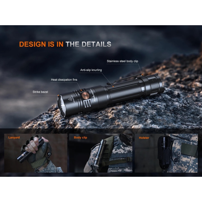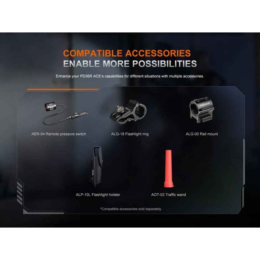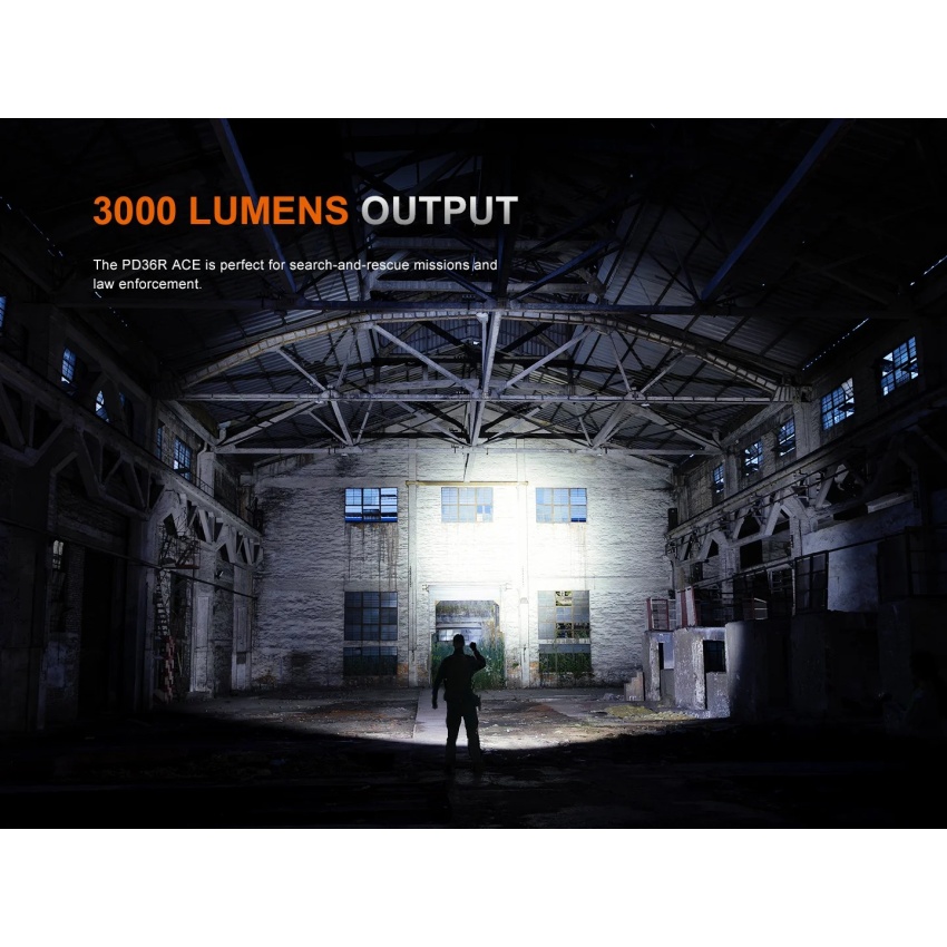 Fenix PD36R ACE on kesksuuruses universaalne taktikalise suunitlusega taskulamp nõudlikule kasutajale. Fenix ACE-seeria (Advanced Command Edition) taskulampidele on iseloomulik see, et kasutaja saab ise valida talle sobiva valgusrežiimide grupi. Fenix PD36R ACE'l on kolm eelseadistatud gruppi: 3000lm ja otselülitus peidetud stroborežiimi, 3000lm+350lm+30lm ja otselülitus peidetud stroborežiimi ning kõik lambi viis erinevat valgustugevust 30lm-3000lm koos peidetud stroborežiimi ja SOS režiimiga. Fenix PD36R ACE stroborežiimi olemasolu on võimalik deaktiveerida kõigis eelseadistatud režiimigruppides. Lambi laadimisporti kaitsva metallist veekindla katte all on eraldi lüliti, mille kaudu saab kasutaja määrata, mis grupi funktsioone ta oma lambi puhul kasutada soovib. Fenix PD36R ACE maksimaalseks valgustugevuseks on 3000 luumenit ning maksimaalseks valgusvoo ulatuseks 415 meetrit. Lamp on valmistatud tüüp III anodeeritud kattega alumiiniumisulamist, omab maksimaalset kaitseklassi IPX8 ning on testitud kuni 2m sügavusel vees. Kompaktse lambi kasutajaliides on vägagi lihtne ja universaalne. Kasutaja saab omale sobiva valgusrežiimide grupi valida laadimispordi mehaanilise katte alla peidetud režiimigrupi lülitist. Edasises töös selle lüliti opereerimine enam vajalik ei ole, kui just ei soovita režiimigruppi muuta. Lamp lülitatakse tööle lambi tagaosas asuvast toitelülitist ning valgustugevuste valimine käib lambi esiossa integreeritud režiimilüliti. Fenix PD36R ACE toiteallikaks on standardne vahetatav tüüp 21700 Li-ion aku (komplekti kuulub 5000mAh aku). Aku laadimine toimub otse läbi lampi integreeritud USB-C laadimispesa. Erinevalt paljudest lampidest, on PD36R ACE laadimispesa turvaliselt peidetud tugevast alumiiniumist mehaanilise katte alla. Lisaks on lamp sobituv laia valiku Fenix'i taktikalise lisavarustusega (relvakinnitused, distantslüliti, hajutid, reguleerija sauad jne), omab toiteallika laetustaseme indikatsiooni ning toiteallika laadimisprotsessi indikatsiooni. Tarnitakse täiskomplektina, kuhu kuuluvad lamp, Fenix'i tüüp 21700 5000mAh Li-ion aku, laadimiskaabel, käepael, tagavara rõngastihendid, kerge vöövutlar ja kasutusjuhend.