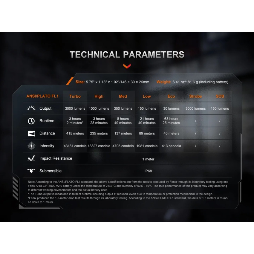 | Töörežiimid koos tööaegadega (ANSI FL1) | 3000lm@3h02min, 1000lm@3h28min, 350lm@8h49min, 150lm@21h49min, 30lm@63h25min, 3000lm strobo, 150lm SOS |