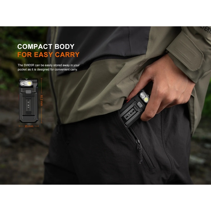 Fenix SW05R on kompaktne (81mm x 35mm x 18mm) otselaetav klambriga rinnataskule, riietusele või rakmetele kinnitatav taskulamp. Peamiselt ette nähtud käed-vabad töövalgustiks korrakaitsesektorisse (dokumentide kontroll või täitmine pimedas), kuid sobib hästi ka universaalvalgustiks matkale ja reisile. SW05R valguspea on pööratav 200 kraadi ulatuses, täpsemalt 105 kraadi ettepoole ja 95 kraadi tagasi. Lisaks on lambi tagaossa paigaldatud kinnitusmagnet, mille abil saab valgusti paigaldada ferromagneetilistele pindadele. Kinnitusklamber on lai, tugev ning mõnusalt madala profiiliga. Lambi laadimine toimub läbi integreeritud USB-C laadimispordi.