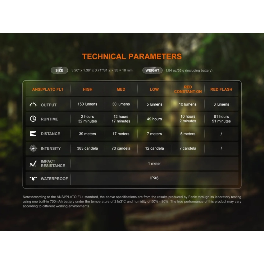 | Maksimaalne valgusvõimsus (ANSI FL1) | 150 luumenit valge + 10 luumenit punane |